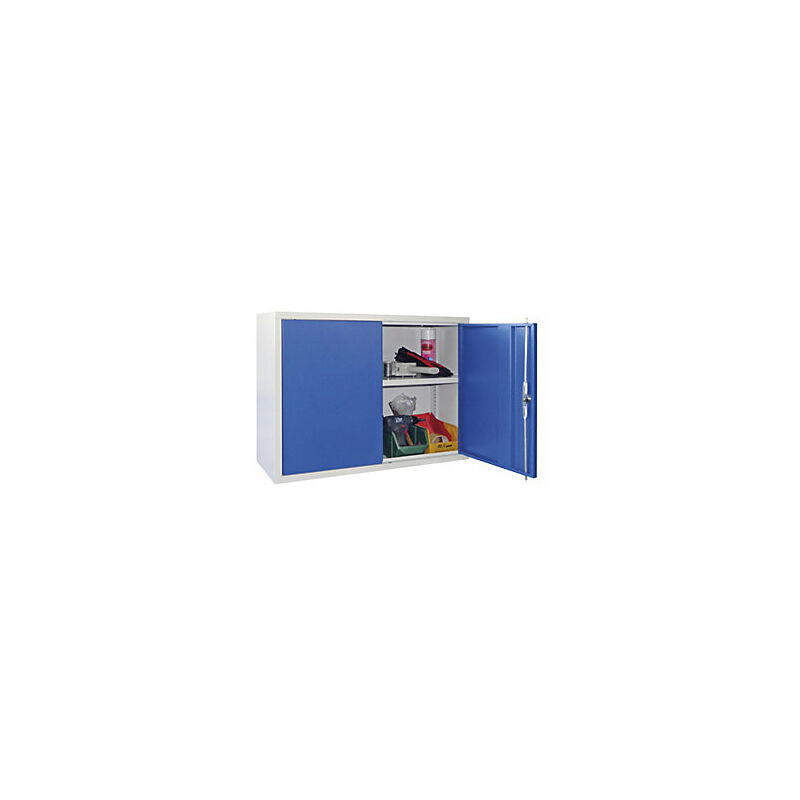 Armadio pensile, altezza 600 mm, con anta/e in lamiera piena, larghezza 800 mm, parete posteriore liscia, grigio/blu. Fornitura = montato. Altezza = 600 mm. Larghezza = 800 mm. Profondità = 300 mm. Numero ripiani = 1 pz. Colore corpo = grigio chiaro RAL 7035. Colore frontalino = blu genziana RAL 5010. Materiale = lamiera d'acciaio. Materiale ripiani = lamiera d'acciaio, verniciata a polvere. Portata per ripiano = 15 kg. Versione porta = con lamiera piena. Serratura = serratura a cilindro. Numero ante = 2 pz. Passo di regolazione altezza ripiani = 17 mm. Peso = 15 kg. Versione = con parete posteriore liscia. Tipo di prodotto = armadietti pensili per officina. Robusta struttura saldata in lamiera d'acciaio di qualità (basta appendere l'armadio). Chiusura con serratura a cilindro (2 chiavi incluse). Altissima resistenza alla torsione grazie a ulteriori saldature angolari. Armadietti pensili con anta/e in lamiera piena. Ante con rinforzi e serratura a cilindro. Portata complessiva per