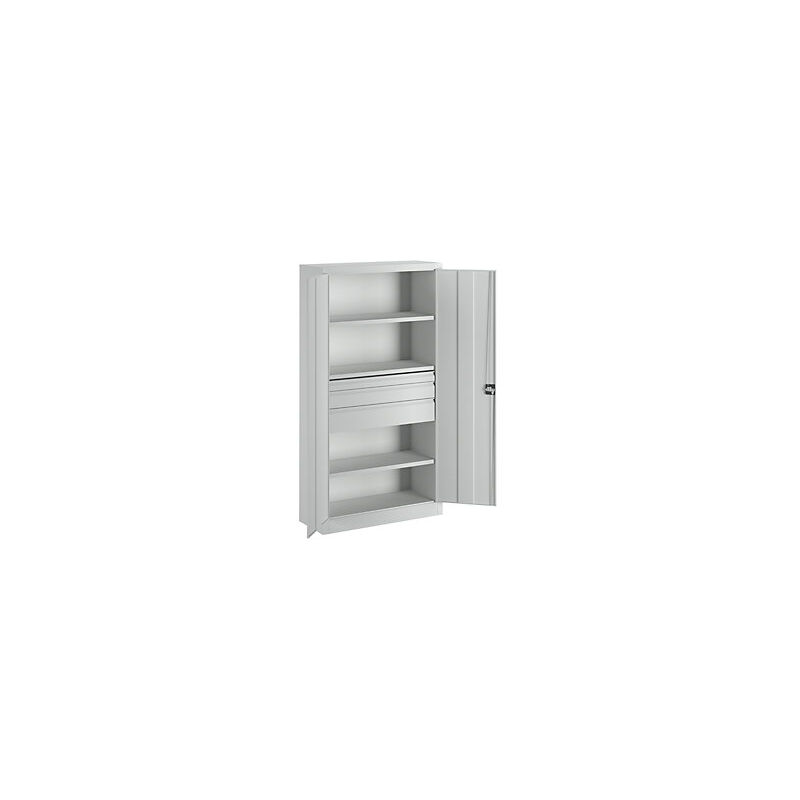Armadio per carichi pesanti, altezza 1950 mm, 3 ripiani, 3 cassetti, grigio. Fornitura = montato. Altezza = 1950 mm. Larghezza = 1040 mm. Profondità = 630 mm. Dotazione interna = 3 ripiani, 3 cassetti. Materiale corpo = lamiera d'acciaio. Superficie = verniciatura a polvere. Materiale ripiani = lamiera d'acciaio, verniciata a polvere. Colore corpo = grigio chiaro RAL 7035. Colore porta = grigio chiaro RAL 7035. Portata per ripiano = 120 kg. Numero ripiani = 3 pz. Passo di regolazione altezza ripiani = 25 mm. Tipo di porta = anta a battente. Particolarmente robusti e indeformabili grazie alla lamiera d'acciaio molto spessa e a una speciale struttura delle sponde. Elementi di allestimento verniciati a polvere e regolabili in altezza con passo di 25 mm. Portata ripiano 120 kg. Robusta struttura saldata in lamiera d'acciaio con pregiata verniciatura a polvere liscia. Portata struttura 1300 kg. Angolo di apertura porta 180°. Ante dotate di rinforzi. Maniglia girevole con chiusura su 3 punti