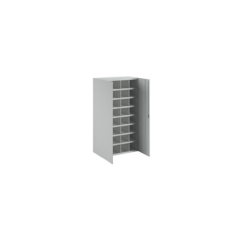 Armadio a scomparti, 32 scomparti, con porte, grigio. Fornitura = montato. Altezza = 1800 mm. Larghezza = 1000 mm. Profondità = 530 mm. Materiale corpo = lamiera d'acciaio. Superficie = verniciatura a polvere. Colore corpo = grigio chiaro RAL 7035. Colore porta = grigio chiaro RAL 7035. Numero ripiani = 7 pz. Tipo di porta = anta a battente. Armadi a scomparti con porta a due battenti con rinforzi e manopola a tripla mandata con serratura a cilindro integrata. Materiale ed attrezzature sempre in ordine. Scomparti fissi con bordino anteriore. Portatarghette integrati. Portata totale per ripiano / armadio: 400 kg con carico uniformemente distribuito. Altezza 1800 mm, larghezza 1000 mm. Con 32 scomparti. Dimensioni scomparti largh. x alt. 220 x 180 mm.