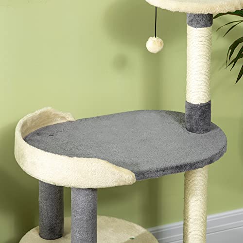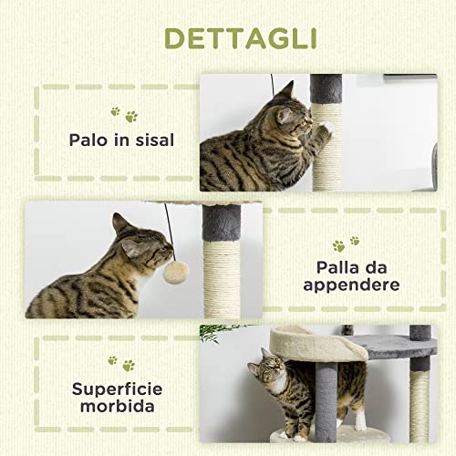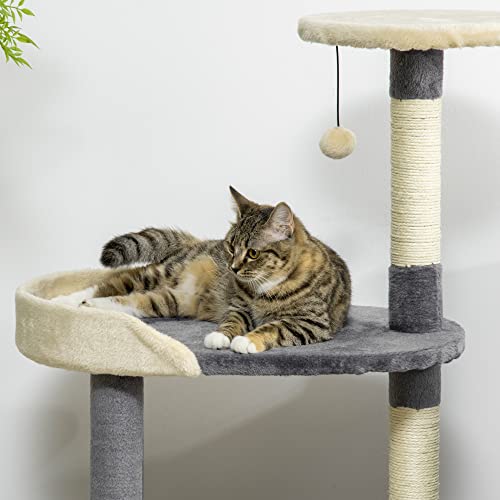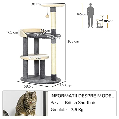 PawHut Albero Tiragraffi a 3 Livelli, Palestra per Gatti con Pallina appesa, Piattaforme e Pali in Sisal in Legno Truciolare e Peluche, 59.5x39.5x105cm, Grigio