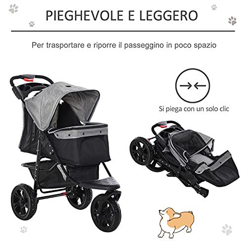 PawHut Passeggino per Cani Pieghevole a 3 Ruote con Freno, Cestino Portaoggetti e Porta Bottiglia, in Acciaio e Oxford, Grigio e Nero, 109.5x57.5x106.5cm