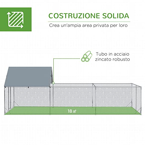 PawHut Pollaio da Giardino per 15-18 Galline in Acciaio Zincato e PE con Tettoia e Serratura,600x300x195 cm,Grigio Argento