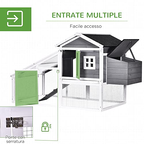 SICURO E ACCESSIBILE: Le diverse porte e la rampa facilitano l'accesso delle galline alle varie zone del pollaio. Le porte richiudibili e la base recintata con rete metallica ti assicurano la massima sicurezza.