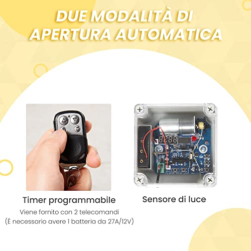 -CONTROLLO A DISTANZA-: Dotata di due telecomandi, la porta automatica del pollaio può essere comandata a distanza senza ostacoli entro un raggio di 40 metri.La porta del pollaio può essere aperta e chiusa con il semplice tocco di un dito.È necessaria una batteria da 27A/12V.