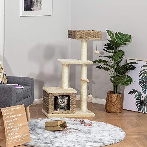 PawHut Tiragraffi a Colonna da 109cm per Gatti fino a 5kg, Albero Tiragraffi con Cuccia, Giochi e Pali in Corda, Beige 60x40x109cm