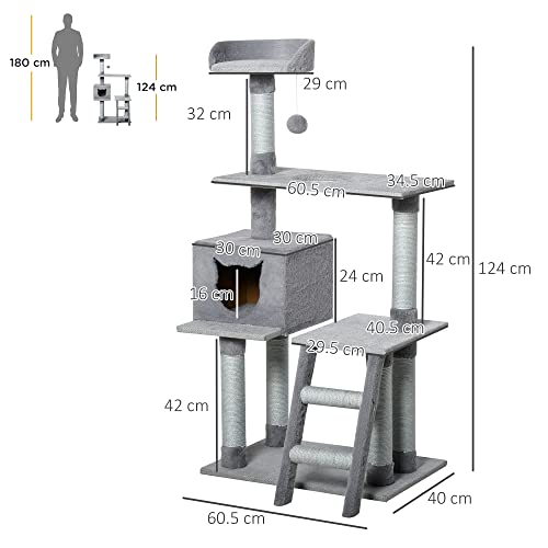 PawHut Tiragraffi Palestra per Gatti Multilivello con Casetta Scala Piattaforme, Pali in Corda di Juta, Grigio, 60.5x40x124cm