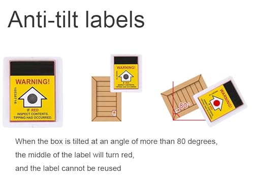 Facile da applicare: staccare la colla autoadesiva, l'etichetta anti-ribaltamento si attiva, l'indicatore viene posizionato verticalmente sul lato più stretto e a rischio di ribaltamento del prodotto e viene applicato un grande adesivo con una freccia rossa rivolta verso l'alto. L'adesivo è un articolo usa e getta e non può essere riutilizzato. L'adesivo non può essere resettato quando diventa rosso.