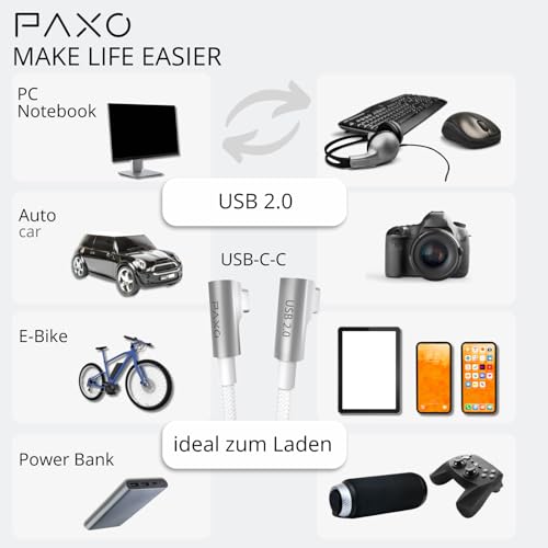 PAXO Cavo di ricarica da 0,2 m, 3A, cavo da USB C a USB C, USB 2.0, elegante spina angolata, guaina in tessuto particolarmente flessibile in bianco