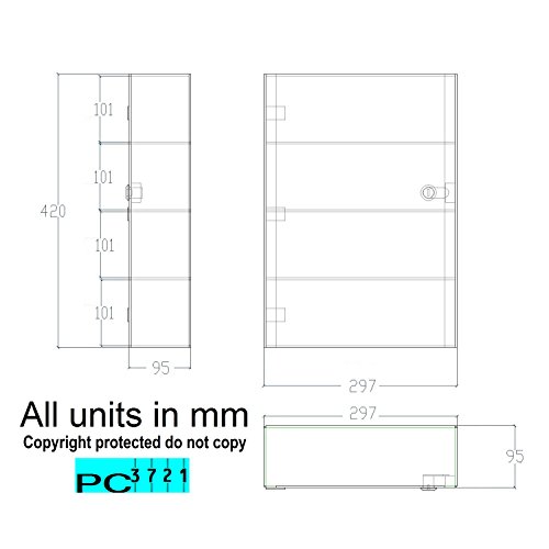 Le dimensioni complessive della vetrina sono 420 x 297 x 95 mm (altezza x larghezza x profondità) o in scala imperiale 16-9/16" altezza x 11-11/16" larghezza x 3-12/16" profondità (pollici) con 3 ripiani fissi di altezza di 101 mm o 4 pollici ciascuno.