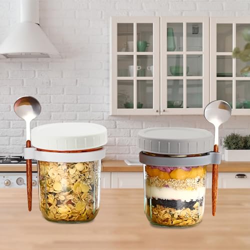 PEALOVCOM 2 Pz Bicchiere da Muesli in Vetro con Cucchiaio Bicchiere per Cereali con Cucchiaio da 350ml Bicchiere di Avena con Coperchio Tazza Yogurt e Cereali per Yogurt, Latte, Cereali, Frutta