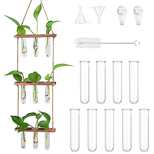 PEALOVCOM Vaso per Provette Sospeso Stazione di Propagazione per Piante con 10 Pz Provette 3 Pz Tavolette di Legno 1 Pz Spago 2 Pz Imbuti e 1 Pz Spazzola per Pulizia per Appendere Fiori di Piante Casa