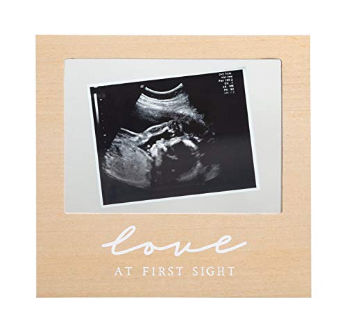 Questa cornice unica in legno neutra per genere legge "amore a prima vista" con spazio per mostrare i tuoi piccoli prima foto prima dell'arrivo del bambino;
