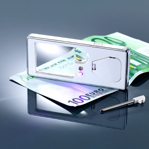 4 in 1: Lente di lettura con 2 ingrandimenti, luce bianca calda, luce UV per controllare banconote, penna a sfera Aspetto moderno in bianco con cornice argentata Dimensioni piccole: 91 x 37 x 8 mm, pesa 42 g