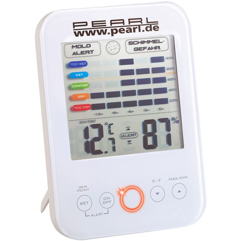 Avverte di eccessiva umidità e rischio di muffe Prevenire la muffa pericolosa: Ora puoi monitorare in modo semplice e affidabile il clima della stanza: nei tuoi soggiorni, in cucina, in bagno, negli scantinati e nei magazzini e molto altro ancora Tutto a colpo d'occhio: È possibile leggere la temperatura e l'umidità correnti sul display chiaro. Puoi anche vedere se il clima della stanza è nella gamma ottimale o se l'aria è troppo secca o troppo umida, anche guardando indietro nelle ultime 12 ore. Ti avverte del rischio di muffa: È possibile programmare facilmente i limiti superiore e inferiore per l'umidità. La memoria minimo / massimo registra anche i valori minimo e massimo misurati. Valori massimi di temperatura e umidità. Per impostare i ganci: Con il supporto pieghevole e il dispositivo di sospensione integrato, il pratico monitor climatico può essere utilizzato in modo flessibile come dispositivo da parete o da tavolo. Si prega di notare che: Questa è una traduzione generata