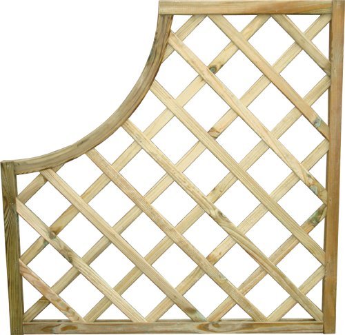Pannello in legno di pino fresco impregnato in autoclave, tramite un processo in cui si utilizzano sali senza cromo per rendere il prodotto durevole e resistente alle muffe - Prodotto con certificazione FSC - Utilizzabile per la separazione e la delimitazione di aree esterne (terrazzi, balconi, giardini, etc.) - Griglia 90x3x90H cm. con angolo concavo - Cornice 30x35 mm., listello 8x30 mm., foro 9x9 cm.