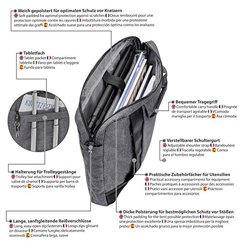 Suddivisione pratica all'interno della borsa per PC portatile grazie ai diversi scomparti: 1x tasca per notebook nello scomparto principale, 2x tasche con cerniera, portachiavi/portapenne e attacco per trolley