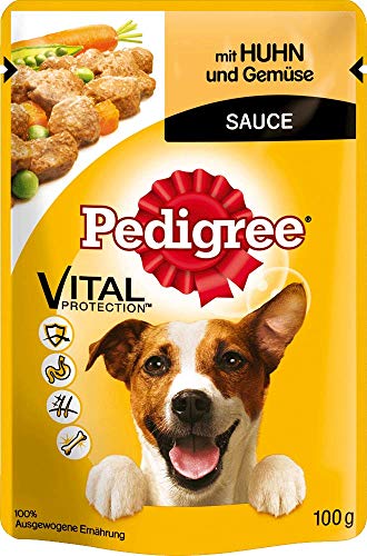 Contenuto della confezione: Mangime per cani di Pedigree, per cani adulti, gusto: pollo e verdure e manzo con verdure in salsa, 52 sacchetti da 100 g ciascuno.
