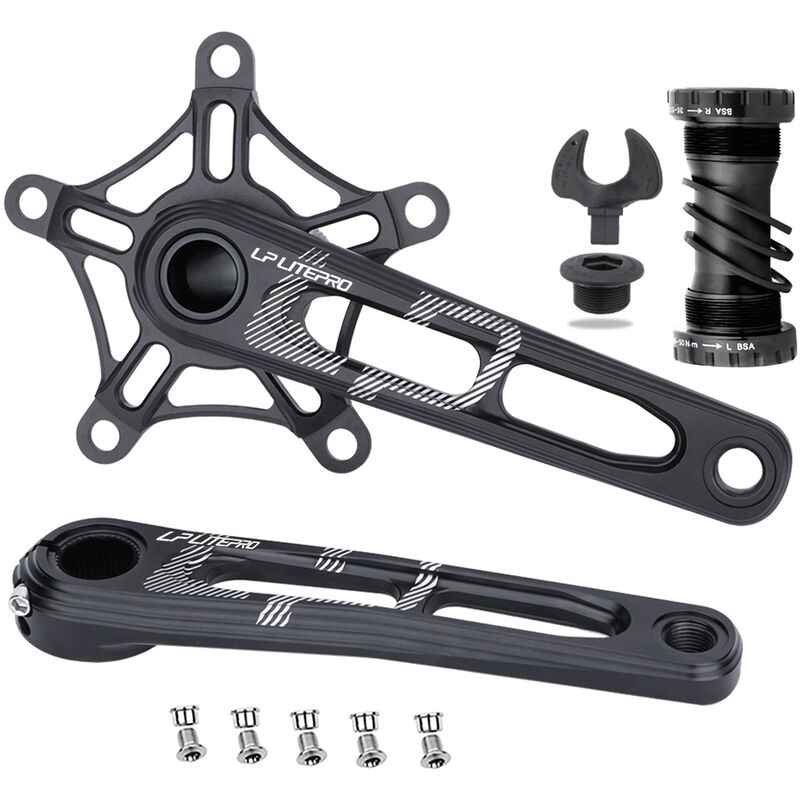 Caratteristiche: La costruzione in lega di alluminio è solida, incredibilmente resistente e leggera. La lavorazione CNC migliora la resistenza e la rigidità. Design scavato per ridurre il peso senza sacrificare la resistenza. Movimento centrale filettato, con buona tenuta e bassa rumorosità. Larghezza del movimento centrale: 68-73 mm. GAV: 130 mm. Lunghezza pedivella: 170 mm. Grandi pezzi di ricambio per biciclette pieghevoli. Specifiche: Materiale: lega di alluminio GAV: 130 mm Lunghezza pedivella: 170 mm Perno: 115 mm Larghezza del movimento centrale: 68-73 mm Peso della pedivella: ca. 473 gr Peso totale: ca. 1000 g Elenco dei pacchetti: 1 set di pedivelle 1 * Movimento centrale 5 * Bulloni 1 * Vite a manovella 1 chiave a brugola per bullone della guarnitura 3 * Guarnizioni in resina