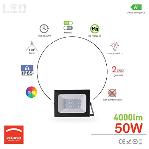 CARATTERISTICHE: Faro LED ultrasottile ed a risparmio energetico - Potenza di 50W luce FREDDA 6000K, con angolo di fascio ampio 120°, che illumina le aree più ampie con una luce più brillante, senza ombre o bagliori. Ottimo sostituto per l'illuminazione esterna alogena tradizionale, con un risparmio di oltre l'82% sulla bolletta elettrica.