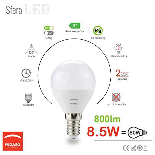 ︵ EFFICIENZA ︵ Lampada LED con forma a SFERA P45 con Attacco E14 (Vite piccola). Potenza di 8,5 WATT equivalenti a 60W delle normali lampadine ad incandescenza. LUCE FREDDA 6000K, Riproduzione cromatica intensa CRI 80+