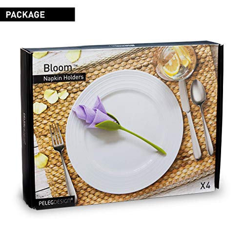Peleg Design Bloom - Set di 8 portatovaglioli per tavoli, in plastica, con gambo verde, con boccioli di fiori, con tovaglioli bianchi, per creare decorazioni originali per la tavola