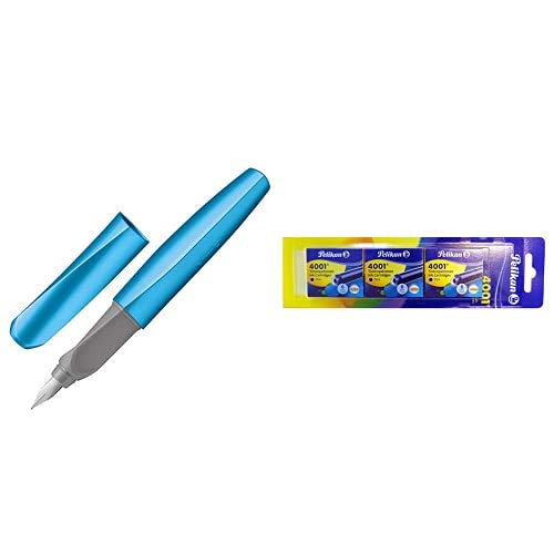 Pelikan 811255 Penna Stilografica Twist, Cartuccia Blu Inclusa, Fusto Ergonomico, Pennino M Acciaio, Azzurro Ghiaccio + Set Cartucce 4001 per Stilografiche TP6, Confezione 18 Unità, Blu Royal, 959221
