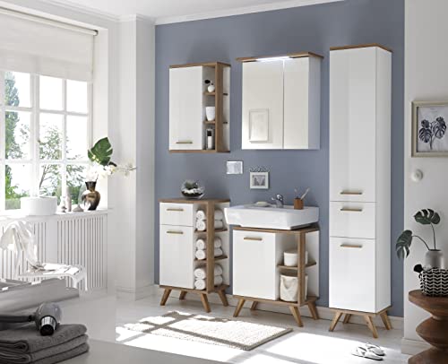 Elegante: questo moderno armadio pensile in bianco lucido/rovere Riviera trasversale con le moderne maniglie in legno è senza dubbio l'attrazione nel vostro bagno