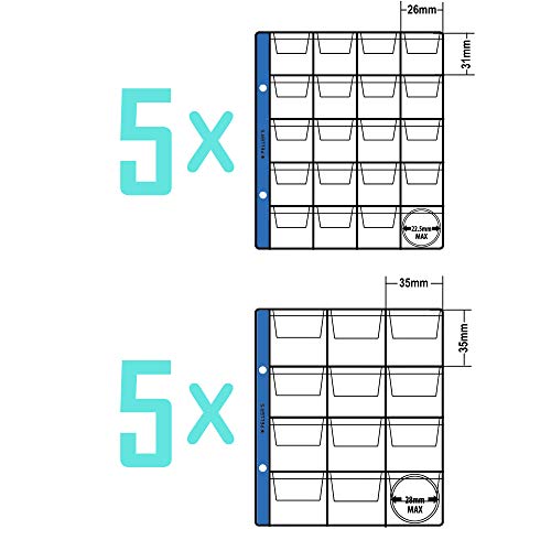 Include 5 fogli per monete a 20 caselle sulla pagina con bordo rinforzato. Caselle con linguetta che si sovrappone: 31mm X 26mm. Per monete piccole fino a 22.5 mm di diametro: centesimi, centesimi di euro e americani, ecc.