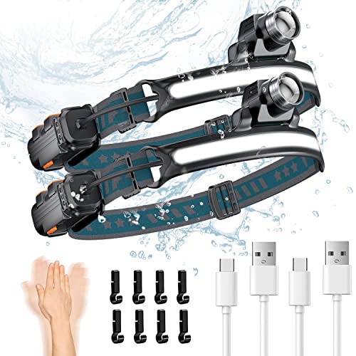 PEMOTech Torcia Frontale(2 Pezzi), 2600mAh Lampada Frontale, 7 modalità, 1200Lux Lampada da Testa USB Ricaricabile, IPX5 Impermeabile, con Fanale Posteriore, per Campeggio, Corsa, Pesca, Bicicletta