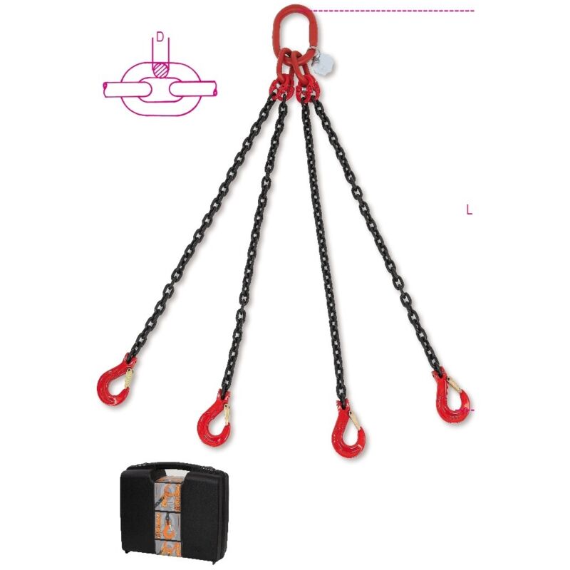 Pendenti per sollevamento catena a 4 bracci in valigetta Tipologia: Pendente Utilizzo: Sollevamento Bracci: 4 Portata: 3,15 t Lunghezza: 1/4 m Diametro catena: 7 mm Coefficiente di sicurezza: 4 Certificazione: Uni en 818-4 Dichiarazione di conformità: Ce Valigetta: Si
