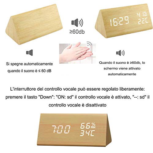 PENGH Sveglia in legno, sveglia digitale a LED in legno, Sveglia da Tavolo con Display Temperatura Umidità ore, 3 Livelli di Luminosità, Controllo Vocale, Sveglia elettronica Doppio Alimentatore