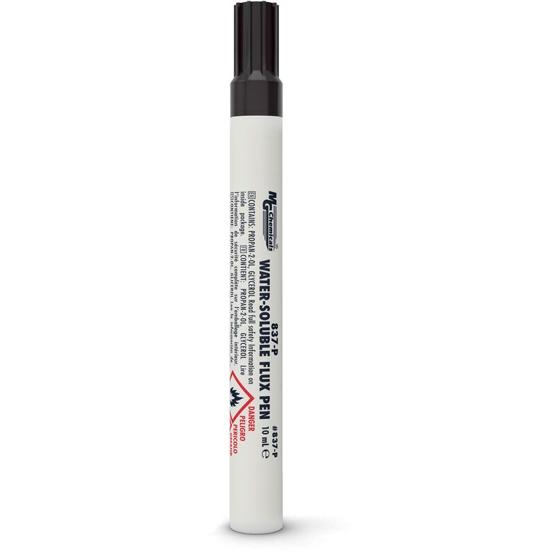 Il flussante idrosolubile 837-P è un flusso di saldatura neutro rimovibile in acqua. Il sistema di attivazione organica nell'837-P ha un ρH neutro a temperatura ambiente e si attiva alla temperatura di saldatura. Il flusso 837-P è formulato per essere efficace su un ampio intervallo di preriscaldamento e può essere utilizzato sia per applicazioni con piombo che senza piombo. Si pulisce facilmente con acqua calda o fredda. Una punta cesellata fornisce l'esatta consegna del flusso alla superficie. La penna 837-P è progettata per erogare il flusso in modo preciso. È eccellente per la prototipazione e la rilavorazione / riparazione di circuiti stampati. Funziona bene su porta chip, dissipatori di calore, pad per dispositivi montati in superficie, interruttori e prese.
