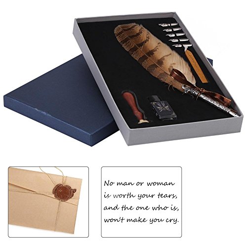 Questo set include anche un bastoncino per ceralacca, un sigillo e una bottiglia di inchiostro vuota, un ottimo regalo per il tuo amico