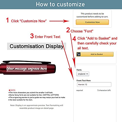 Personalizzazione gratuita ★ Puoi avere fino a 50 caratteri (spazi inclusi) su ogni riga, fino a 2 linee personalizzate sono gratuite. Usiamo la tecnologia di incisione laser per incidere il testo sulla penna senza sbiadire. Finché fai clic sull'opzione "Personalizza", puoi facilmente personalizzarla. Bellissimo aspetto, adatto come regalo.