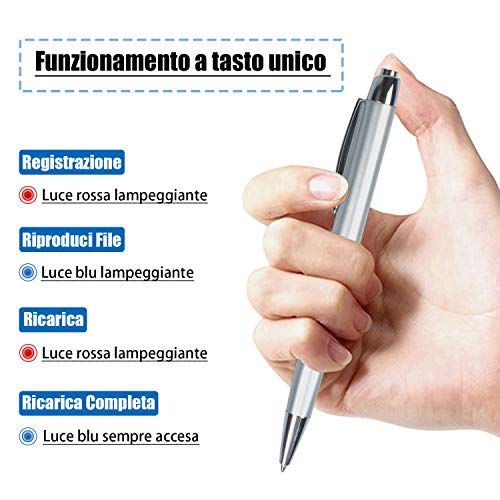 【Registrazione ad Attivazione Vocale】- Il dispositivo registrerà soltato dopo aver rilevato un suono superiore ai 45dB. Micro registratore vocale, penna per scrivere, lettore MP3, USB 4 in 1 funzione. Basta premere il pulsante per registrare quello che vuoi, Musica, Lezioni, Riunioni, Interviste.