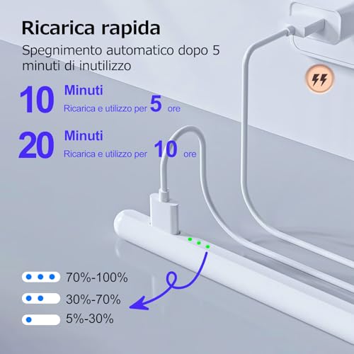 Spegnimento automatico: toccare l'interruttore superiore per avviare e chiudere la penna stylus pen. 10 ore di funzionamento continuo, 60 minuti di autonomia di 60 giorni in stand-by, questa penna per smartphone si spegne automaticamente dopo 5 minuti di sonno a vuoto, per risparmiare energia. (Nota: una pellicola protettiva troppo spessa può compromettere l'efficacia del dispositivo. ).