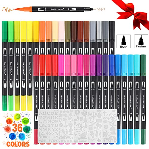 Pennarelli Doppia Punta, 36 Colorati Pennarelli Punta Fine con 5 Modelli Stencil per Bambini e Adulti Libro Colorare, Pennarelli Pennarelli Acquerellabili per Calligrafia, Disegno, Schizzi, Pittura