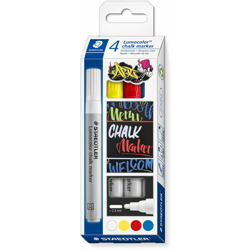 Torna in ufficio senza dimenticarti di nulla! Compra Pennarelli a gesso liquido Staedtler Lumocolor 344 4 Pezzi e sarai l'invidia dei tuoi colleghi! Tipo: Pennarello per Lavagna Numero di pezzi: 4 Pezzi Colore: Multicolore Caratteristiche: Inchiostro a base d'acqua Spessore: 2,4 mm
