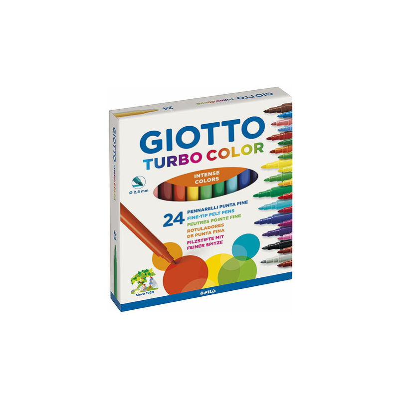 Nome stile: Valigetta 24 uds. Descrizione del prodotto Colori turbo. Quando avete bisogno di un colore, Giotto Turbo Color non vi abbandona mai! Creati con inchiostro lavabile e innocuo, hanno una punta arrotondata in fibra super resistente che non affonda mai. Disponibili in 36 colori vivaci, i pennarelli Giotto Turbo Color sono sicuri al 100% grazie al cappuccio ventilato. Nota bene: Questo prodotto viene fornito dal produttore sotto forma di un assortimento vario di modelli e/o colori. È impossibile per noi offrirvi uno di questi modelli e/o colori specifici, quindi ne riceverete uno a caso (a seconda della disponibilità). Grazie per la vostra comprensione. Contenuto della confezione 24 pennarelli Giotto Turbo Color ideali per la scuola: Giotto Turbo Color sono inchiostri sicuri a base d'acqua, lavabili sulla pelle con acqua e sapone e sui tessuti con un normale ciclo di lavaggio in lavatrice a 40°. Si distinguono inoltre come pennarelli di lunga durata. Formati disponibili