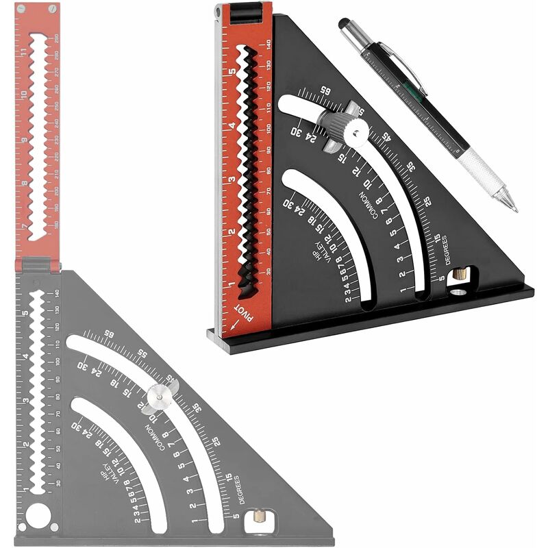una varietà di funzioni le misurazioni sono adatte a diversi scenari. 【NUOVI STRUMENTI 4 IN 1】 Questa nuova squadra da falegname in alluminio include 5 strumenti: righello, squadra, righello da falegname, goniometro. Può essere utilizzato come goniometro, righello, guida per sega e squadra. E la coda dello strumento L'estrattore dell'ago in acciaio inossidabile è fissato al righello con viti