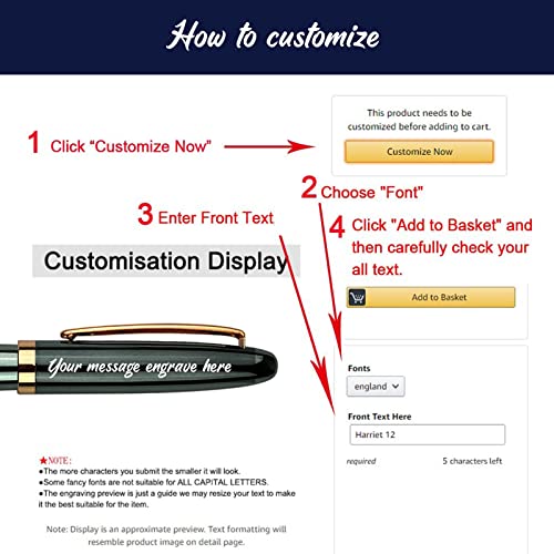 Personalizzazione gratuita ★ Puoi avere fino a 40 caratteri (spazi inclusi) su ogni riga, fino a 2 linee personalizzate sono gratuite. usiamo la tecnologia dell'incisione laser per incidere il testo sulla penna senza sbiadire. Finché fai clic sull'opzione "Personalizza", puoi facilmente personalizzarla. Bellissimo aspetto, adatto per regalo.