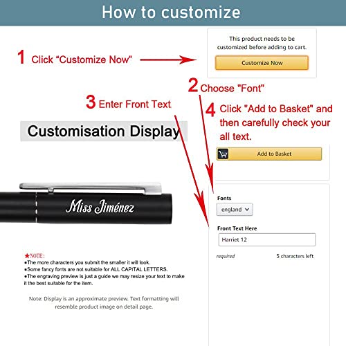 Personalizzazione gratuita ★ Puoi avere fino a 50 caratteri (spazi inclusi) su ogni riga, fino a 2 linee personalizzate sono gratuite. Usiamo la tecnologia di incisione laser per incidere il testo sulla penna senza sbiadire. Finché fai clic sull'opzione "Personalizza", puoi facilmente personalizzarla. Bellissimo aspetto, adatto come regalo.