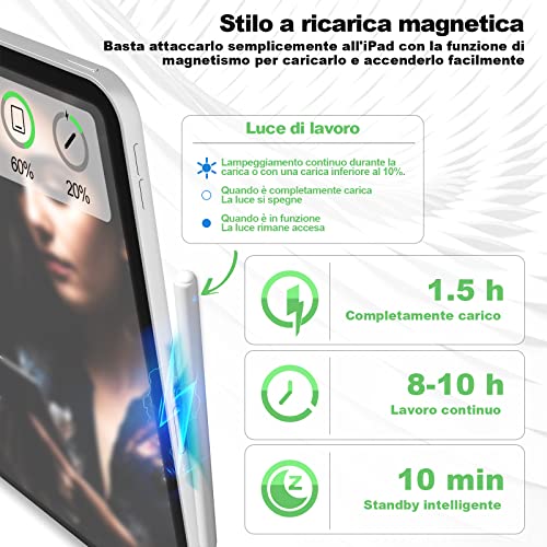Pennino Stylus per iPad con ricarica magnetica wireless e rifiuto palmare sensibile all'inclinazione, compatibile con iPad Pencil 2a generazione per iPad 10/9/8/7/6,Air 3/4/5,iPad Pro11/12.9,Mini 5/6