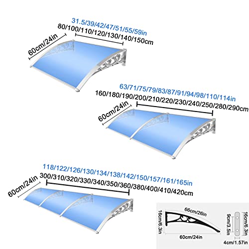 Pensilina Tettoia in Policarbonato Alveolare Trasparente,Pensilina Tettoia per Porta e Finestre Tenda da Sole Blu con Sostegni a Muro,Pensilina Copriporta Per Esterno (60x80cm)