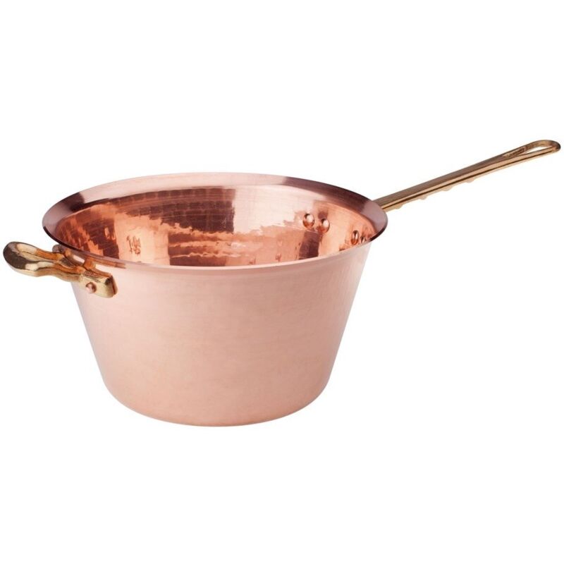 Il Rame è indicato per le cotture lunghe ed accurate, per le lavorazioni di pasticceria a temperature precise e per gli appassionati che sanno “muovere” gli strumenti di cottura, governando a dovere calore e colpi di fia mma. Gli strumenti di cottura in rame si tramandano di generazione in generazione, la patina del tempo le rende affascinanti. Frutto di una maestria artigiana, la ga mma è disponibile sia in rame liscio, la lavorazione attuale dal moderno design, che in rame martellato, la lavorazione classica dal fascino antico. Appese in una cucina rendono l'ambiente ottimo. Esso trova impiego, a meno di peculiarità culinarie che prevedono l'impiego del materiale così come è, con la superficie interna stagnata artigianalmente a rendere l'uso in cucina igienica e sicura.
