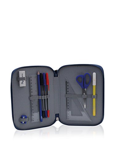 Include gomma, temperamatite, righello, matita, penna blu e rossa, forbici, evidenziatore, squadra, 12 pastelli e 12 pennarelli.