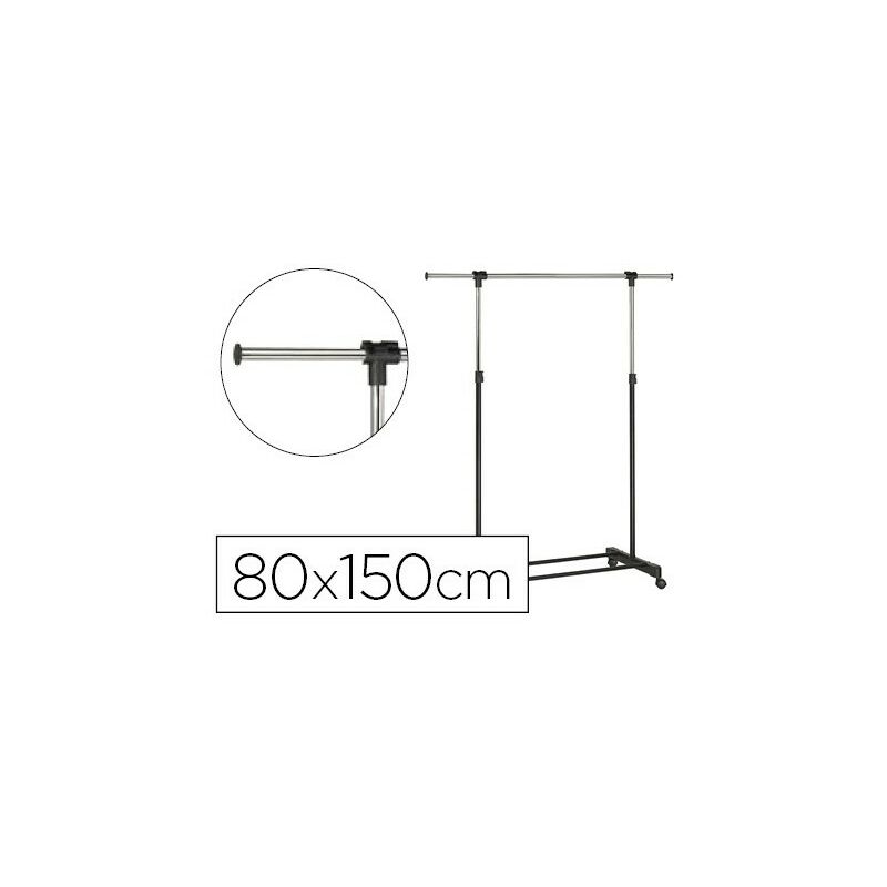 Appendiabiti con ruote per facilitarne il movimento. La sua traversa è regolabile in altezza e larghezza. Con capacidad per 40 capi e 20 kg di peso. Colore nero/cromo. Dimensioni: 80 - 150 x 102 - 166 x 42 cm. Peso: 1,9 kg.