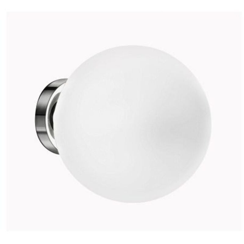 Applique con montatura in metallo cromo lucido e diffusore a sfera in vetro soffiato e acidato