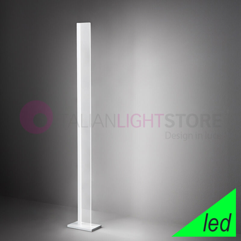 Piantana in metallo e alluminio verniciato a polveri di colore bianco opaco e diffusore in acrilico trasparente con microincisioni a laser, interruttore touch dimmer posizionato sulla parte superiore dell'asta