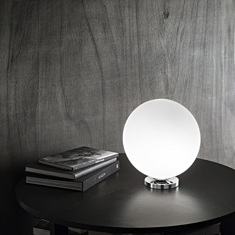 Collezione Grape LA LAMPADA DALLA LUCE FRIZZANTE Lampada da tavolo con design elegante e moderno. La struttura è in cromo lucido e il diffusore è in vetro bianco, che emana una luce morbida e uniforme.. Grazie alla sua forma sferica, si adatta a diversi tipi di ambienti e stili di arredamento, come ad esempio un soggiorno, una camera da letto o un corridoio. Questo prodotto di alta qualità combina funzionalità ed estetica, fornendo una soluzione luminosa pratica ed esteticamente gradevole.